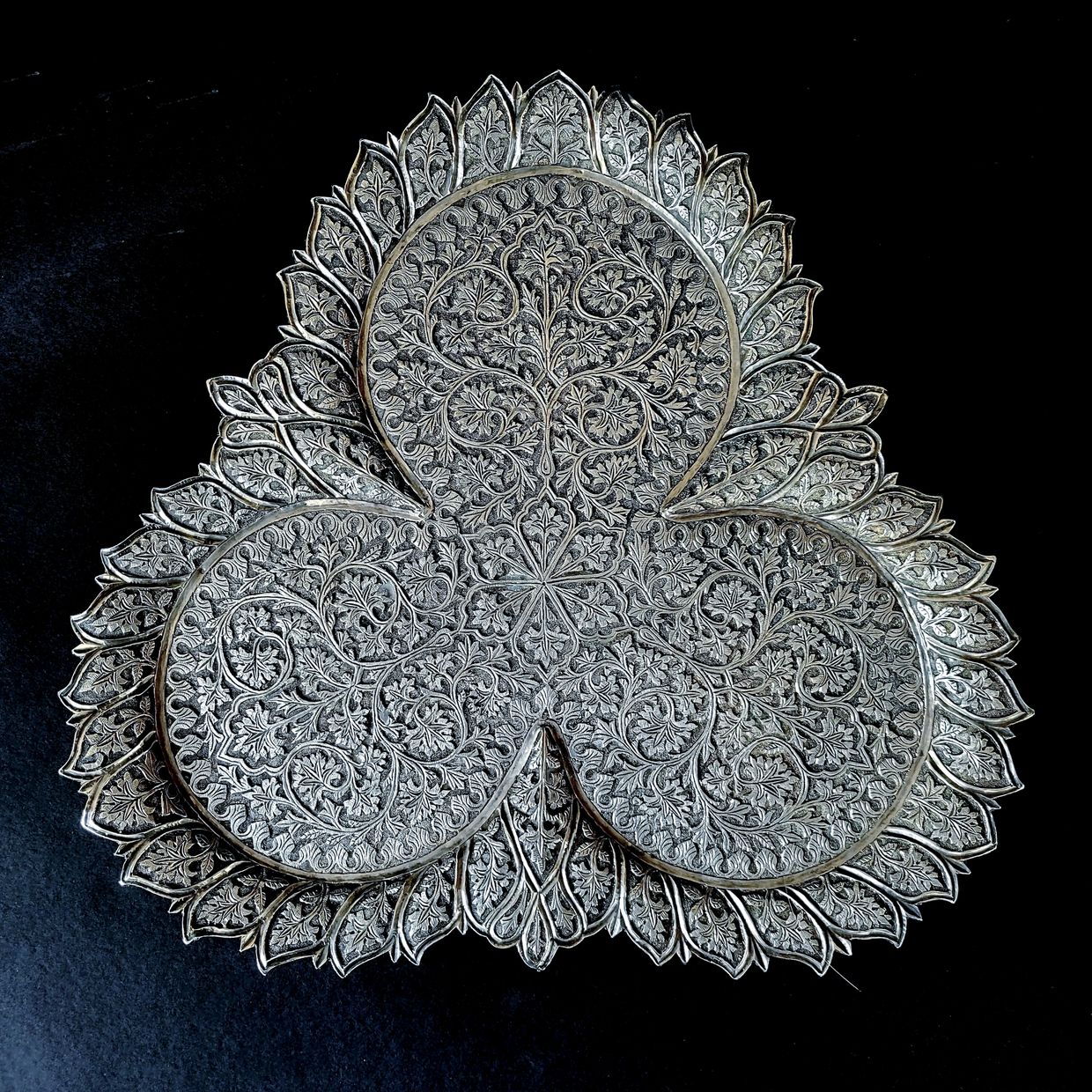 Although engraved silver was very popular in other parts of India but here again, the Kashmiri craftsmen, established their own distinct aesthetic in carved silver. Adhering to their religious belief that prohibited carving human or animal images, the Kashmiri silversmiths adorned their wares with intricately carved and repousse flora of their native land and of course the unmistakable shawl pattern. Another detail, unique to Kashmir sliver is the use of snakes for handles and occasionally as decorative elements.